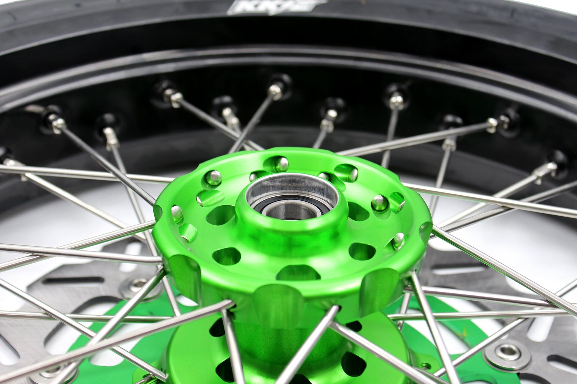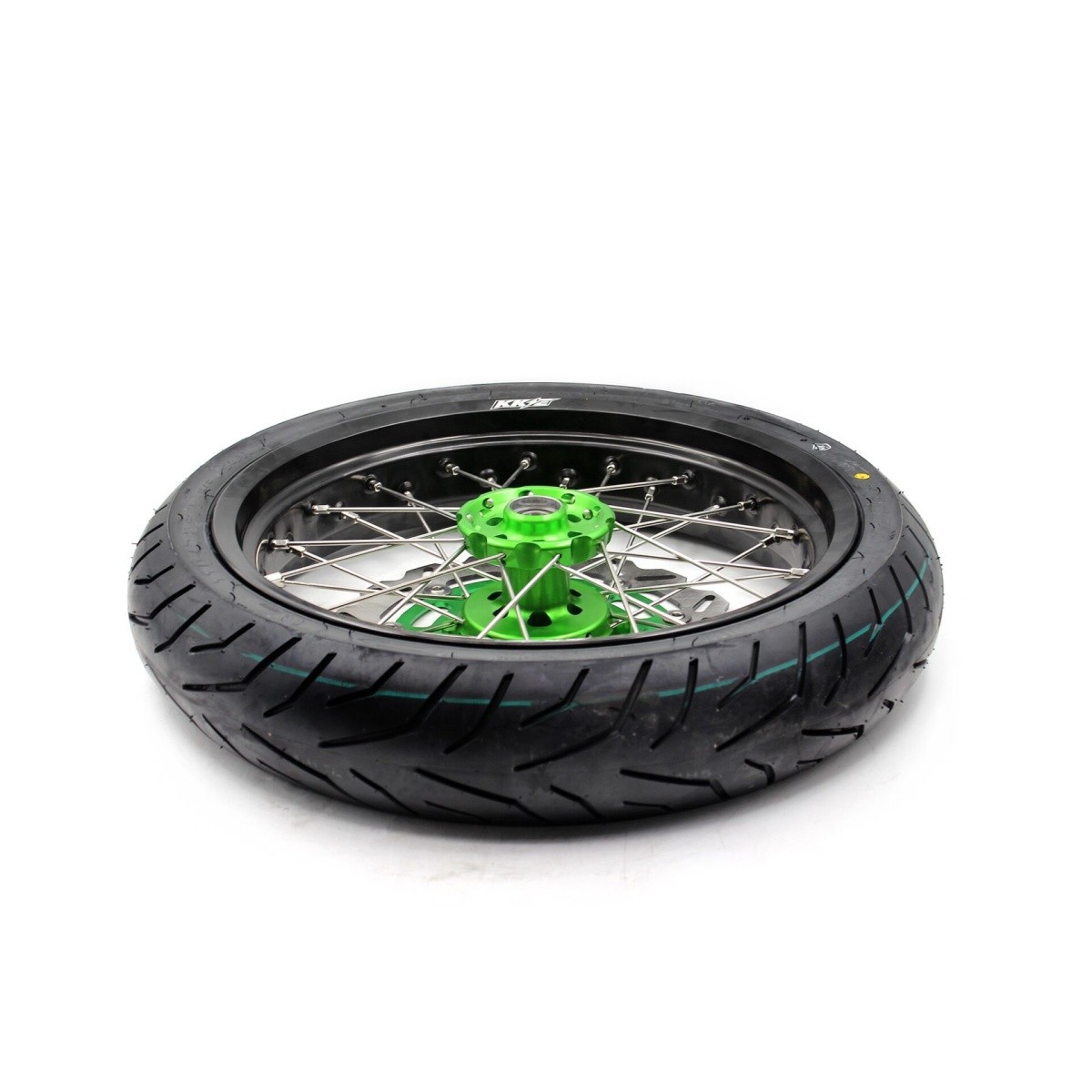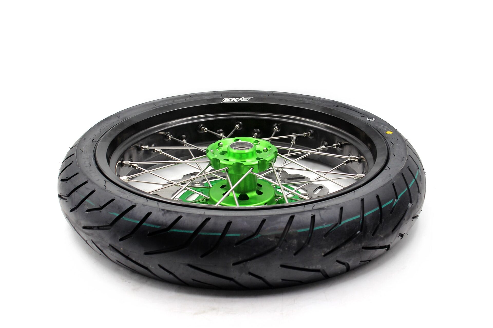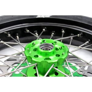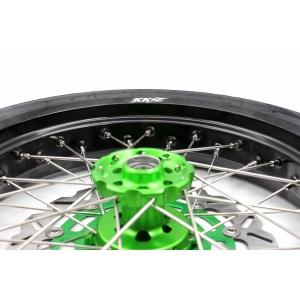 - Green hub, black rim, silver nipple, silver spoke