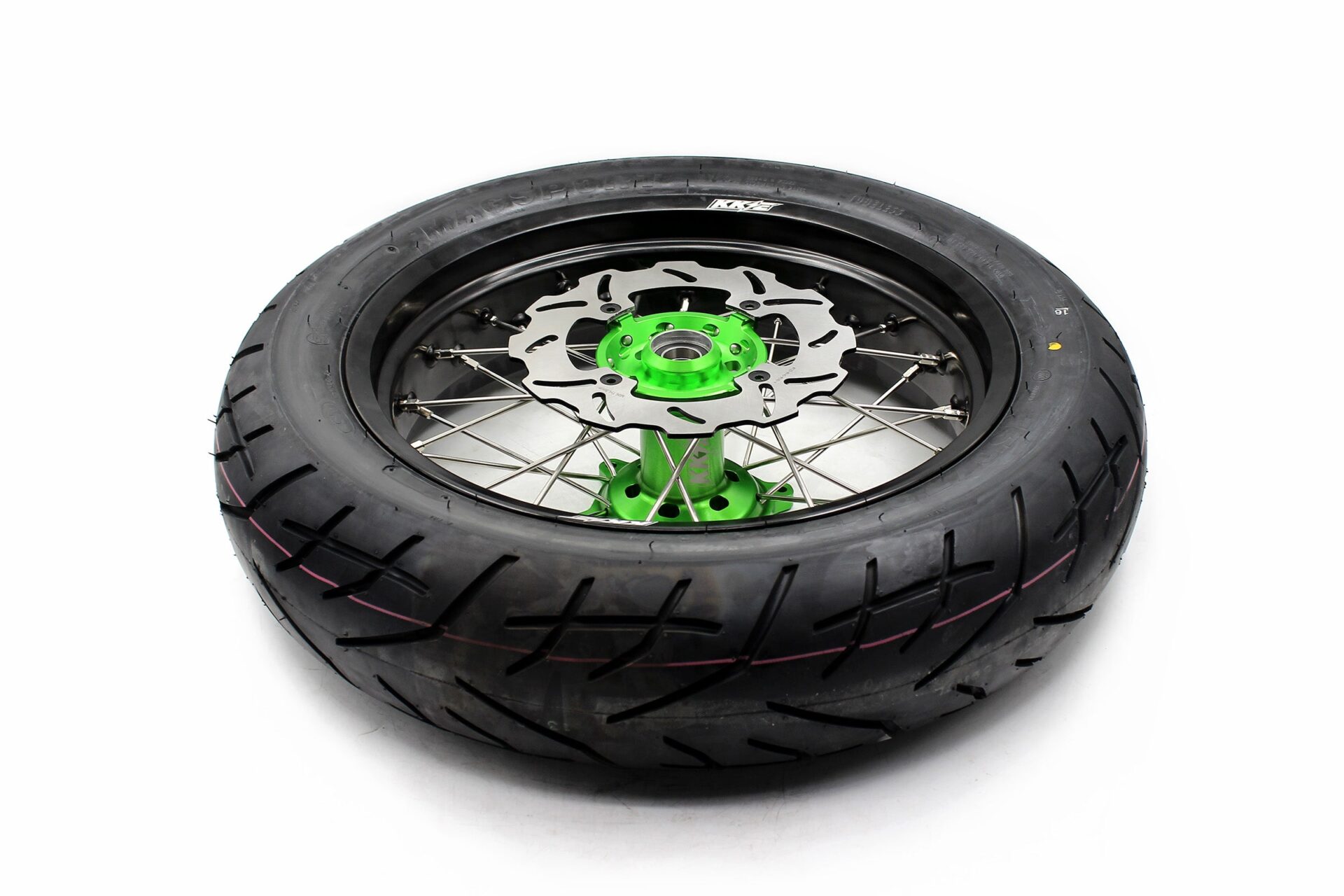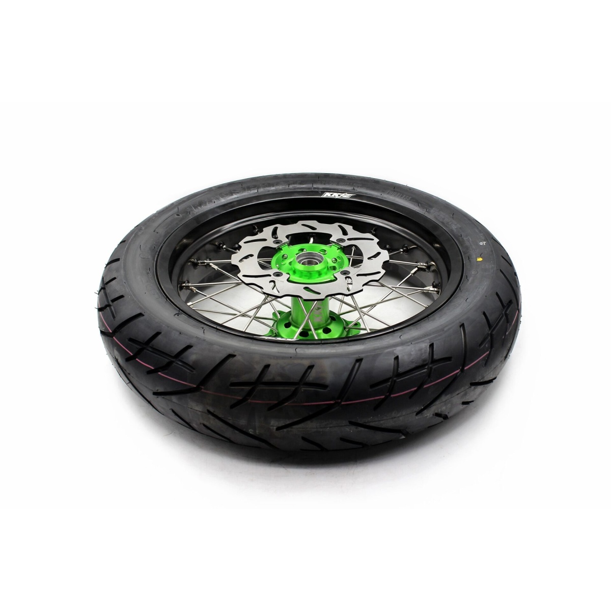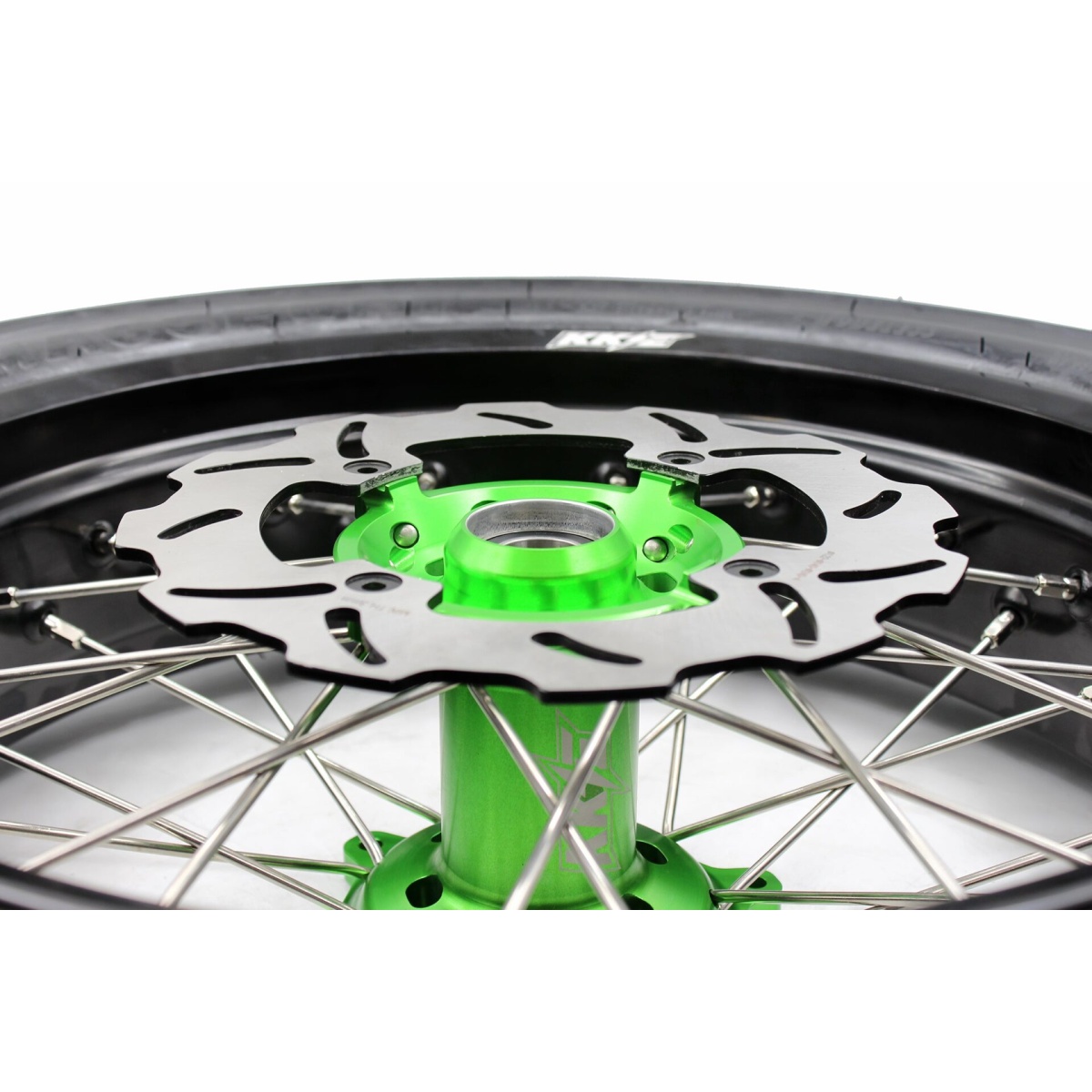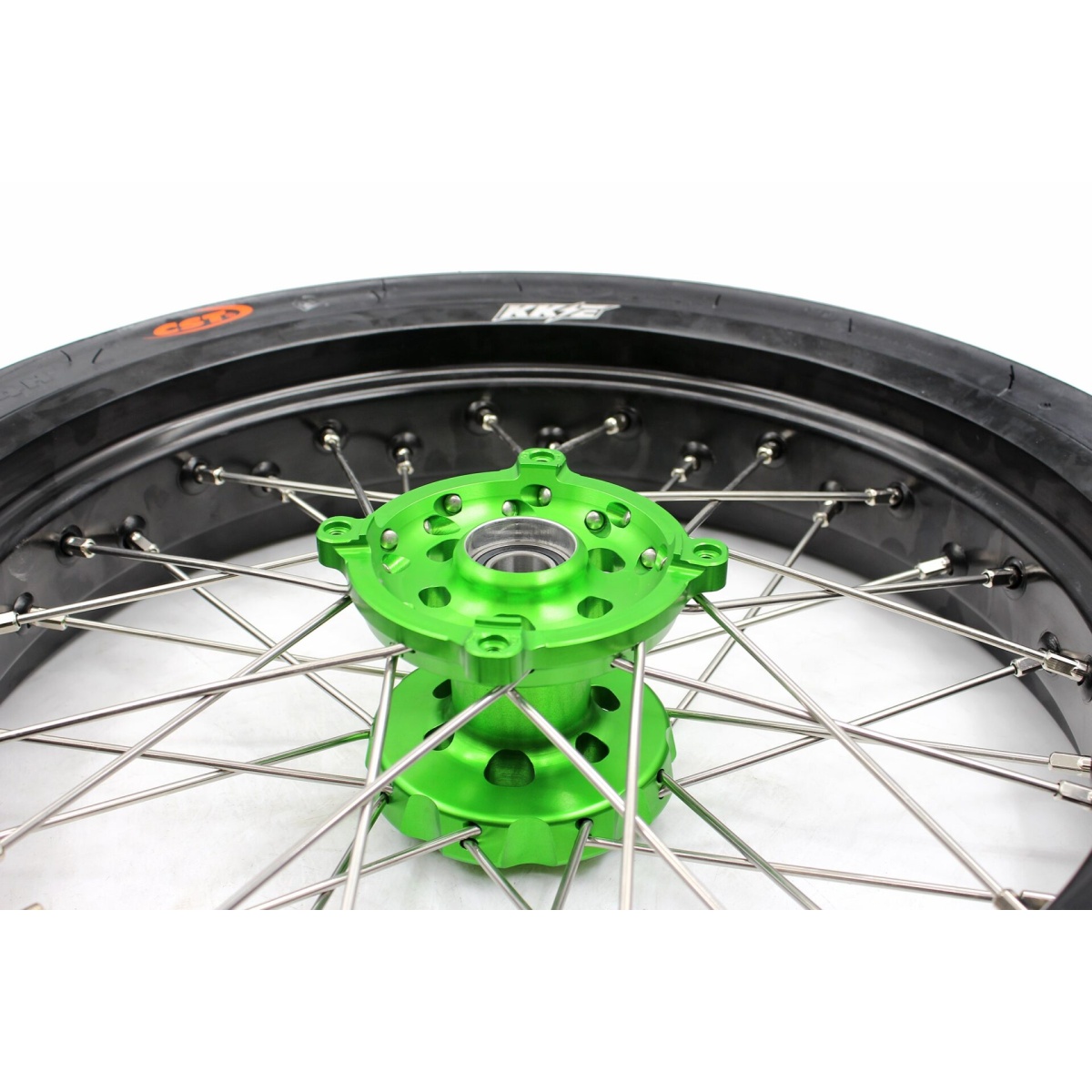 - Green hub, black rim, silver nipple, silver spoke