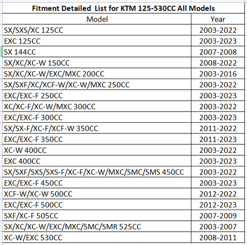 - For KTM SX/XC 125-530CC Models 2003-2022