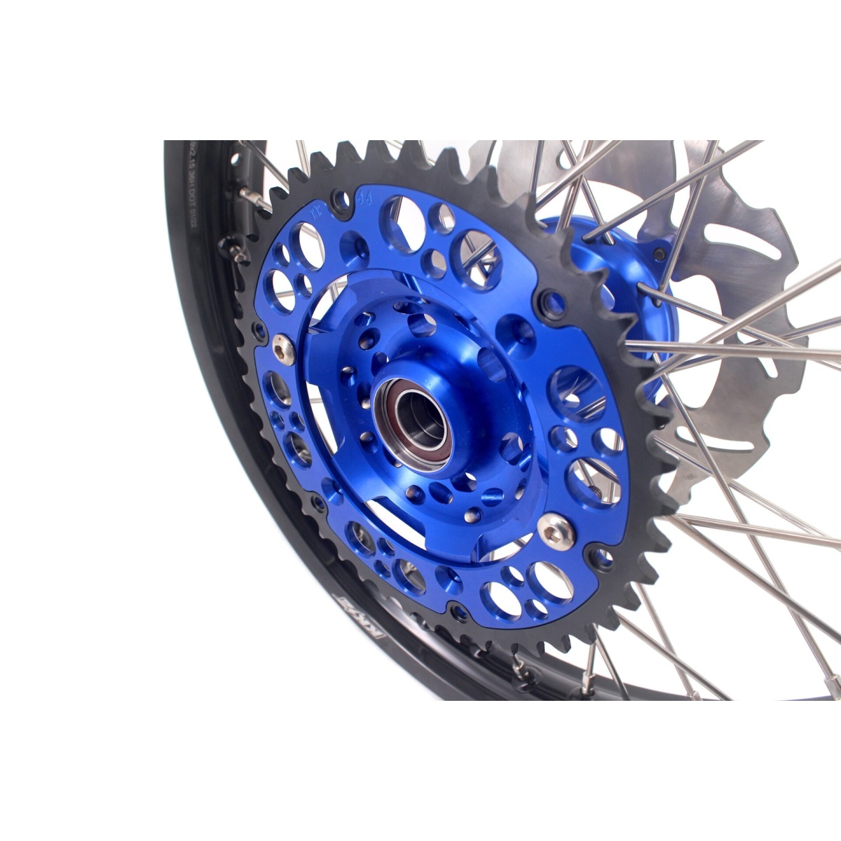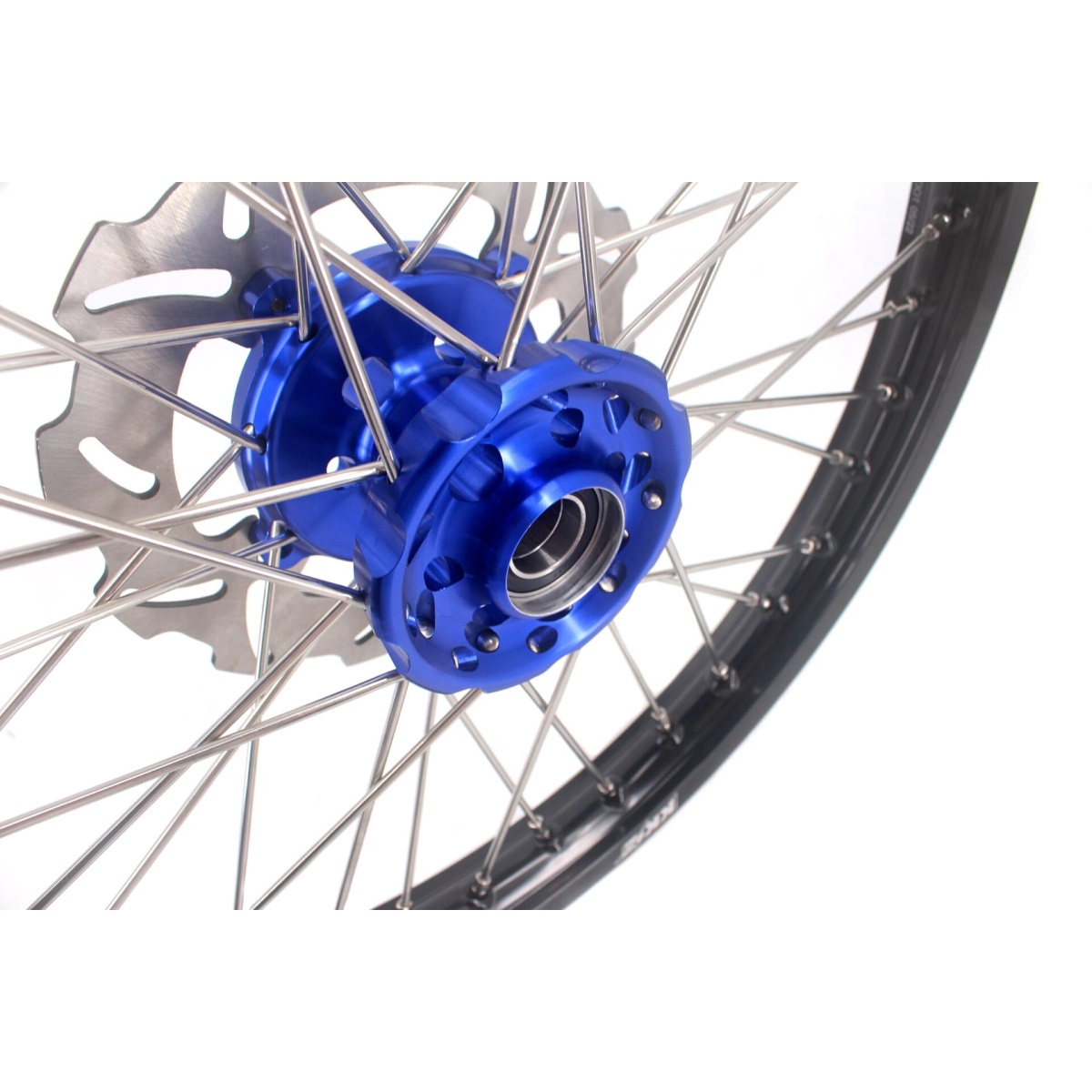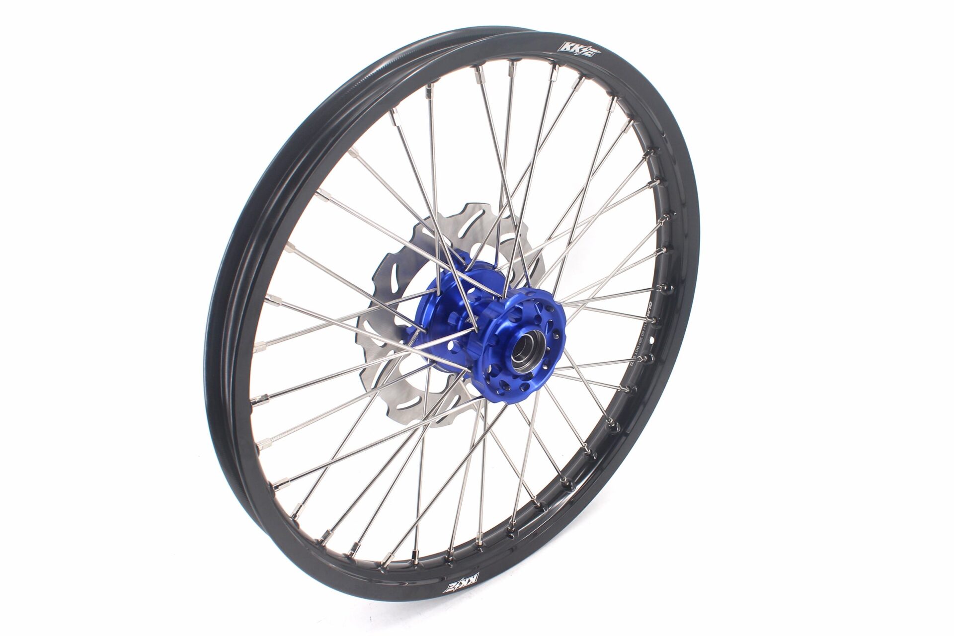 - Blue hub, black rim, silver nipple, silver spoke