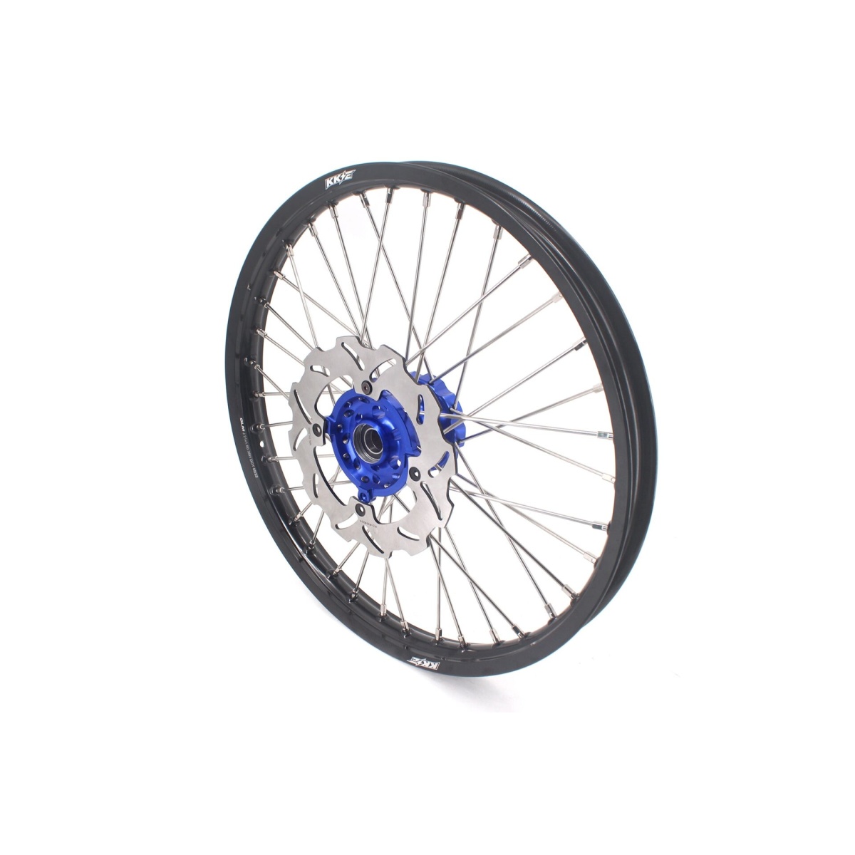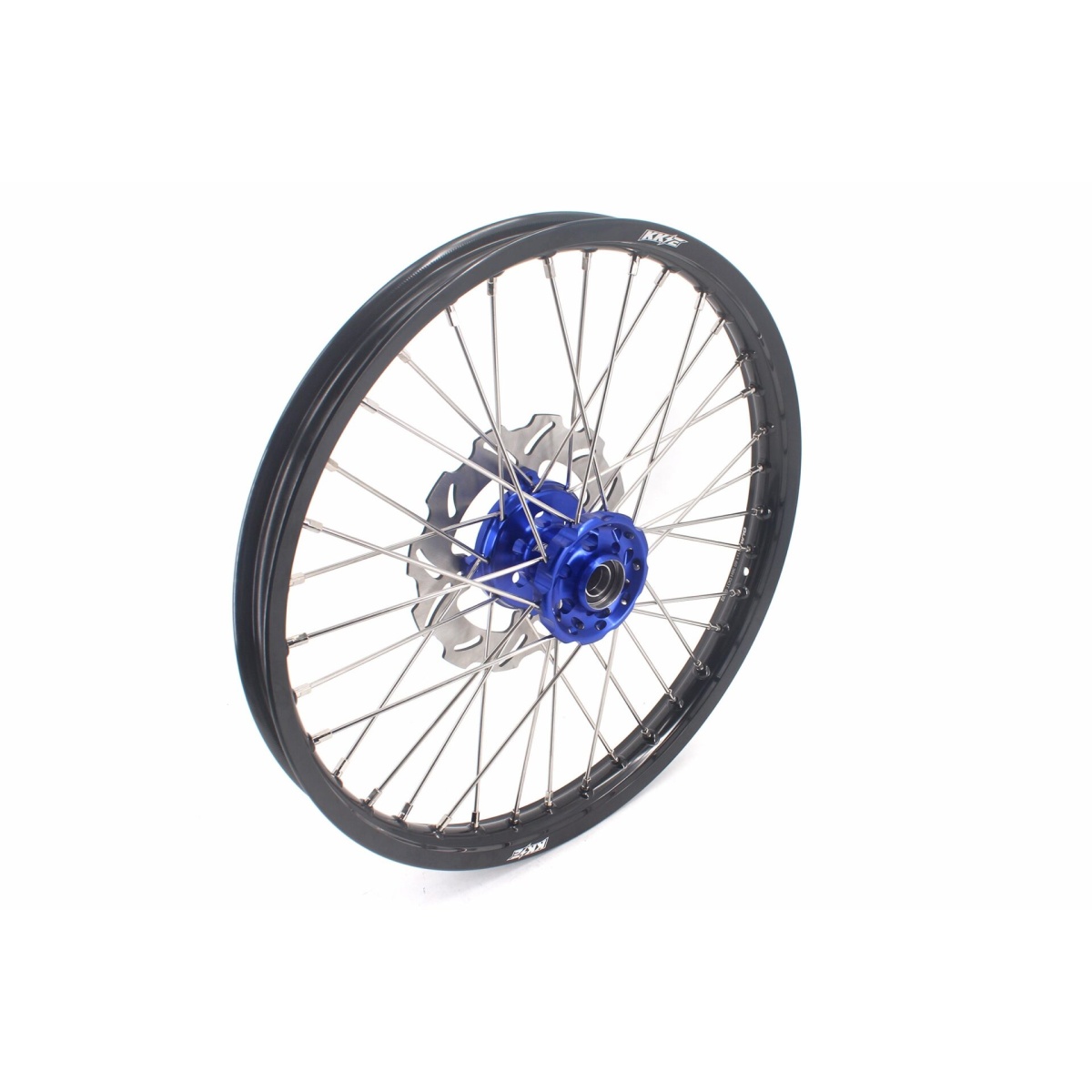 - Blue hub, black rim, silver nipple, silver spoke