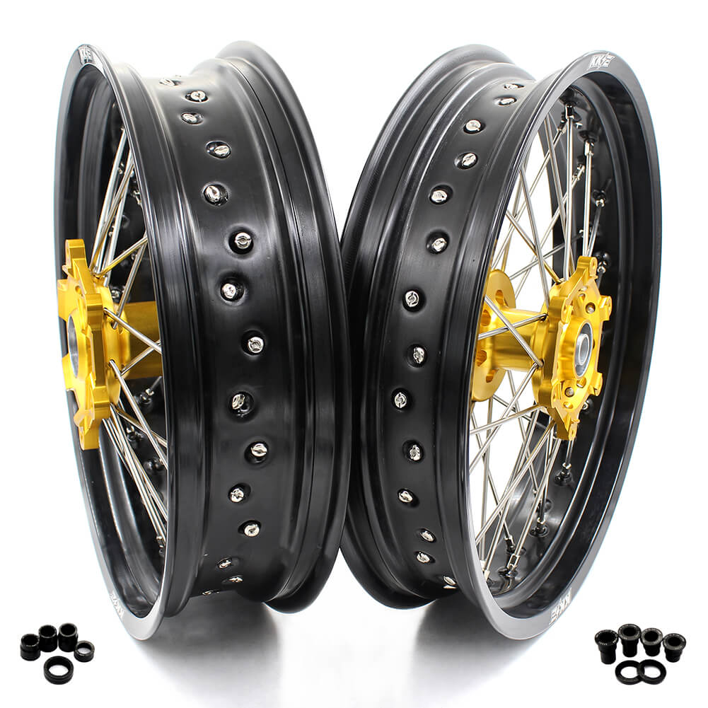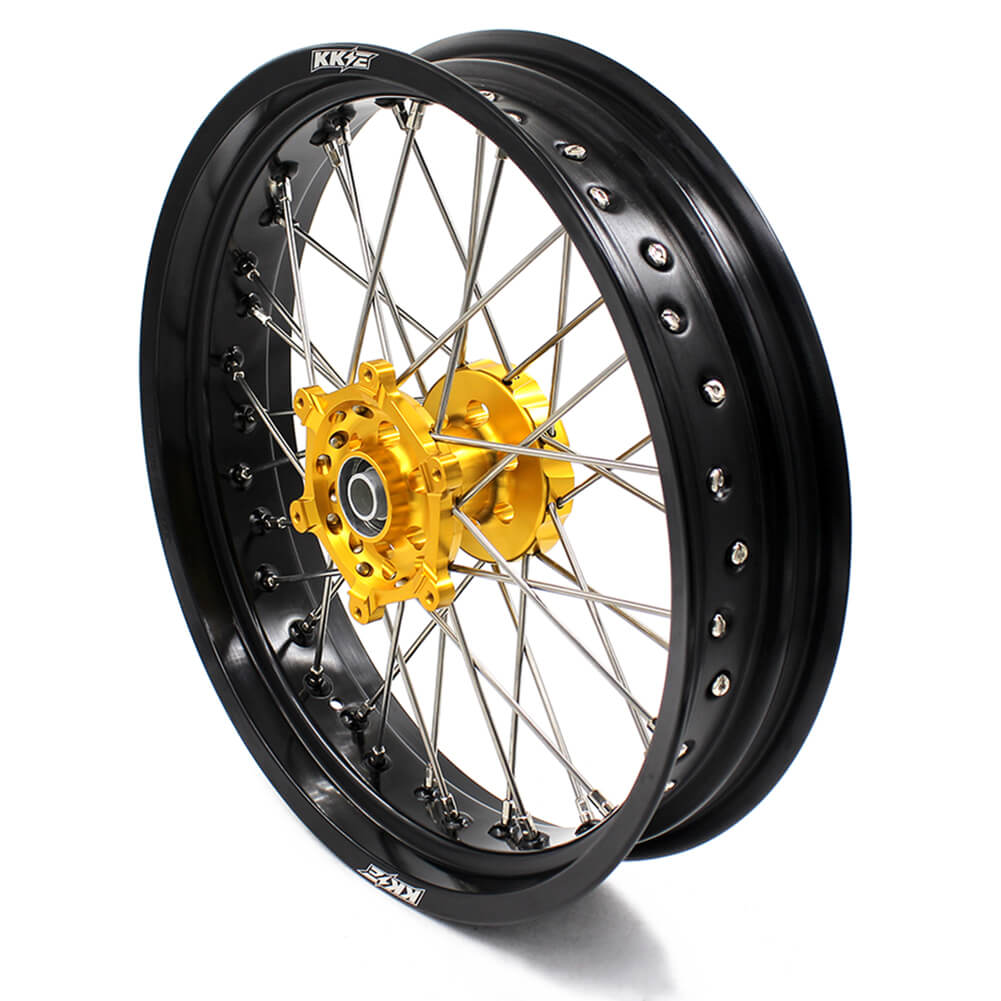 - Gold hub, Black rim, Silver nipple, Silver spoke