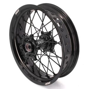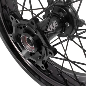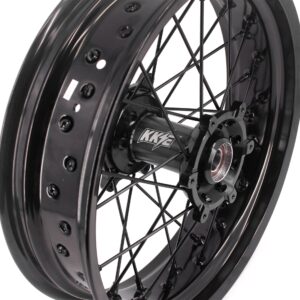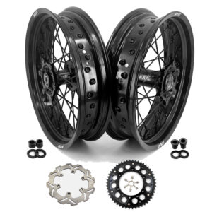Upgrade your DRZ400SM (2005–2024) with the KKE 3.5/4.25″ Supermoto spoked wheel set. Featuring CNC‑machined 6082‑T6 hubs, 7050‑T6 aluminum rims, and stainless‑steel spokes with alloy nipples, this fully assembled kit includes bearings, spacers, seals, tube, and front/rear wheels. Black-on-black styling with optional disc and sprocket completes the look. With a one‑year defect warranty and compatibility with OEM discs, sprockets, and speedometer, it’s a plug‑and‑play supermoto upgrade.