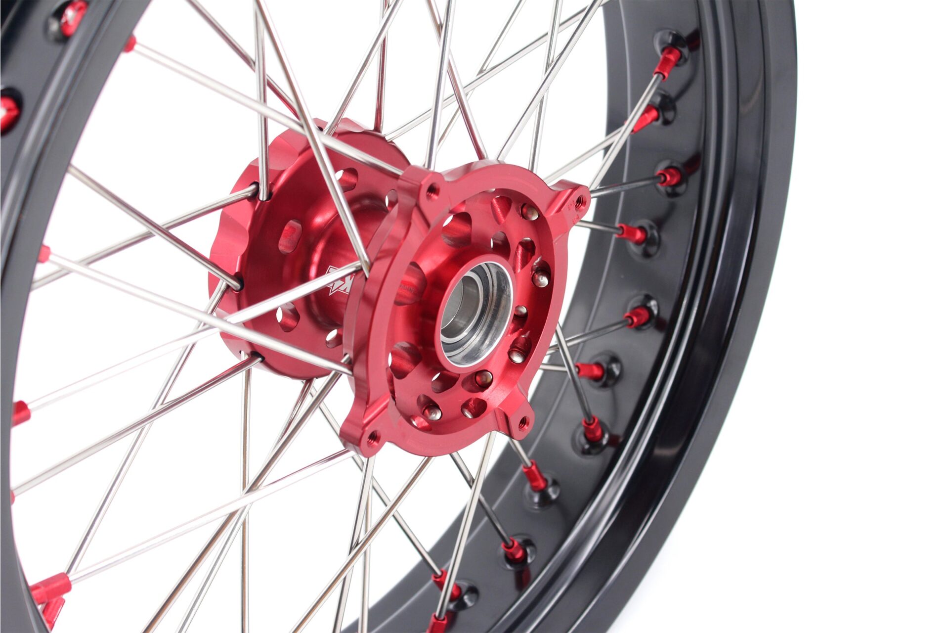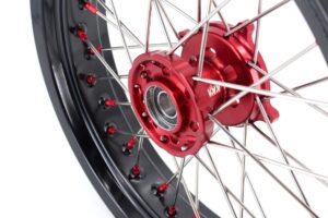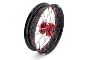- Red hub, black rim, red nipple, silver spoke