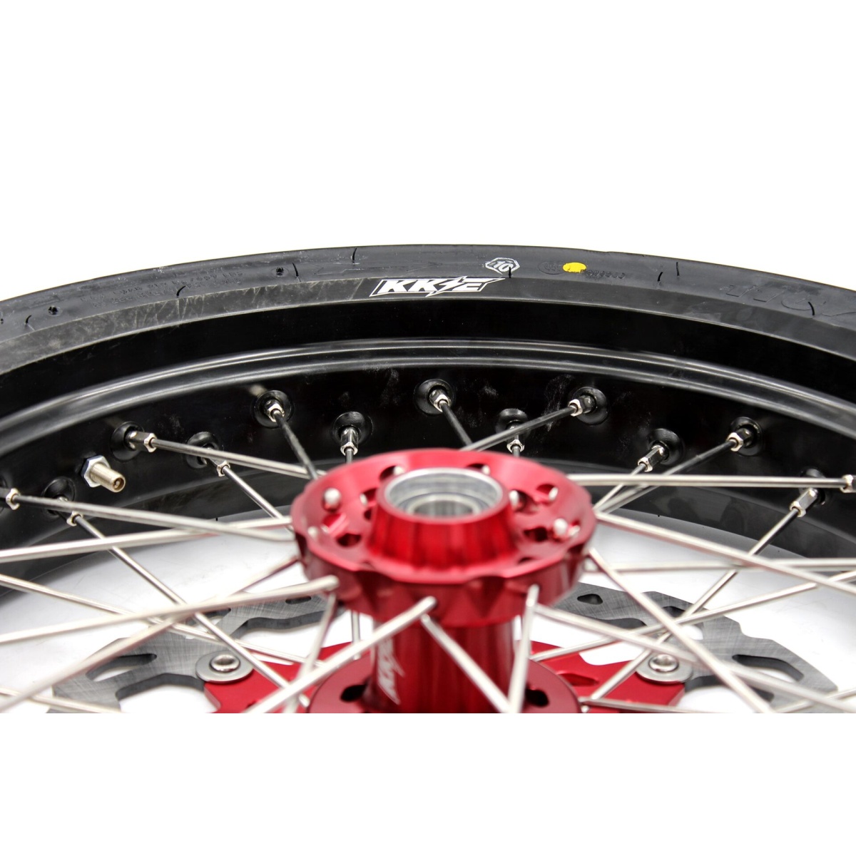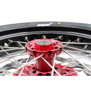 - Red hub, black rim, silver nipple, silver spoke