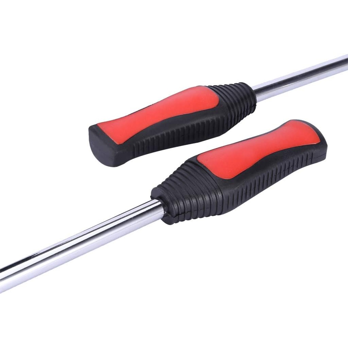 Each spoon is crafted from high-strength heat-treated steel, ensuring durability and resistance to bending under pressure. The polished ends allow for smooth insertion between the tire and rim, while the non-slip plastic handles provide a secure and comfortable grip during use. At approximately 11.4 inches in length, these spoons offer optimal leverage for even the most stubborn tire beads.